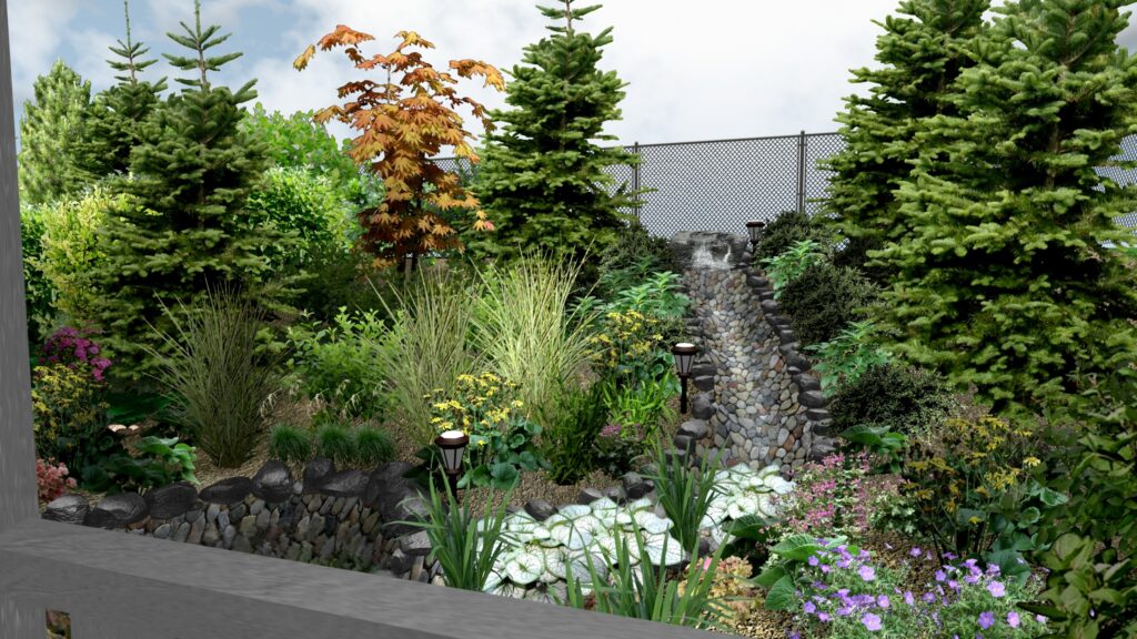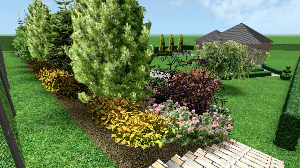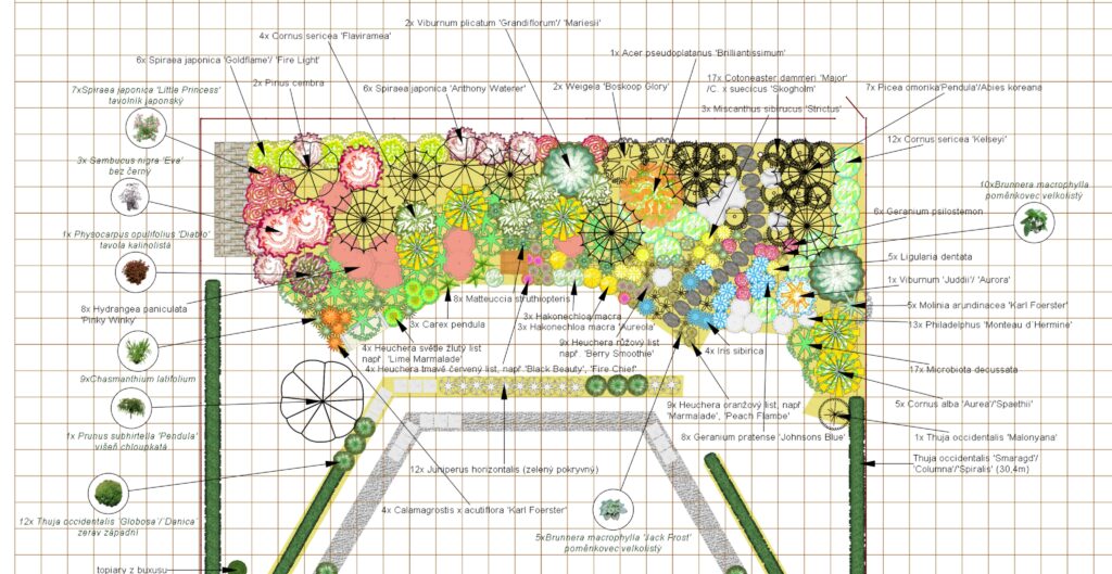 Celoroční architektonickou kostru výsadby ve svahu tvoří špičaté smrky Picea omorika ‚Pendula‘ nebo jedle Abies koreana a válcovité borovice limby Pinus cembra. Barevně je během vegetačního období doplňují opadavé keře: červenolisté tavoly Physocarpus opulifolius ‚Diablo‘, červenolistý bez černý Sambucus nigra ‚Eva‘; žlutolisté svídy Cornus alba ‚Aurea‘ nebo ‚Spaethii‘ a žlutolisté tavolníky Spiraea japonica ‚Goldflame‘ nebo ‚Fire Light‘ →