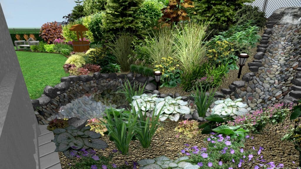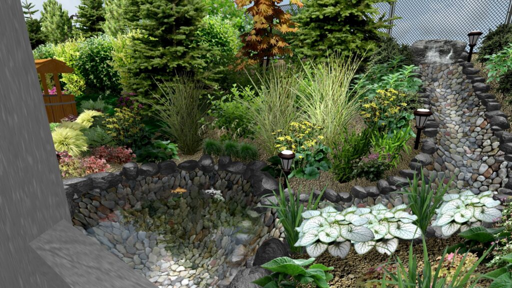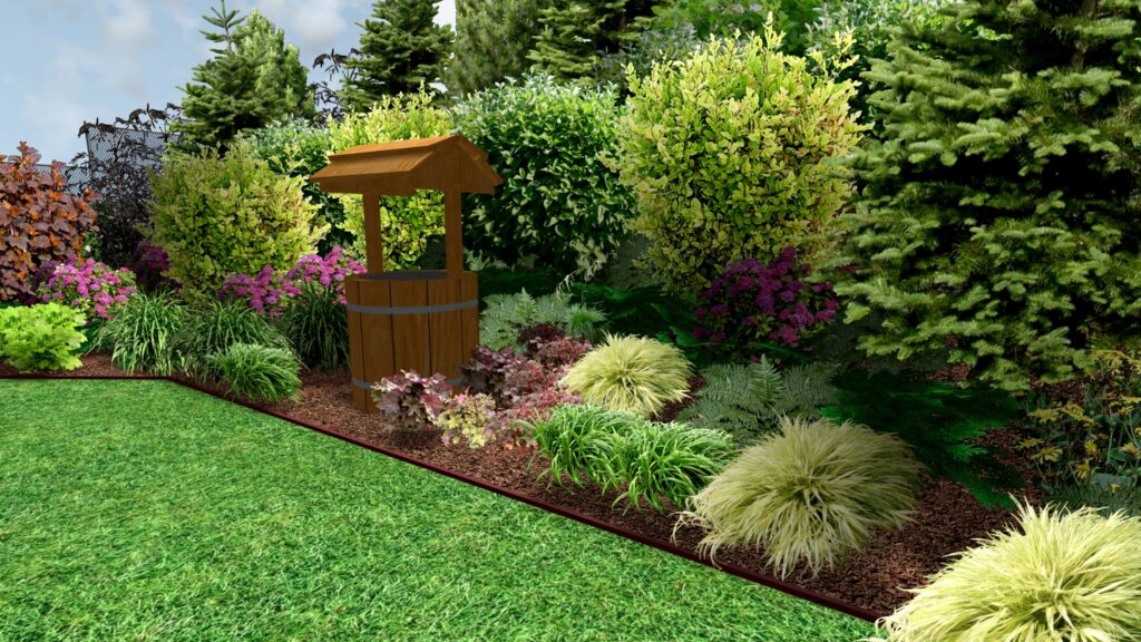 Kolem rumpálu tvoří výsadbu kapradina pérovník pštrosí Matteuccia struthiopteris, ostřice Carex pendula, tráva rákosovka Hakonechloa macra i její žlutolistý kultivar Hakonechloa macra ‚Aureola‘, dlužichy Heuchera s tmavě červeným listem, např. ‚Black Beauty‘ nebo ‚Fire Chief‘ a Heuchera se světle žlutým listem např. ‚Lime Marmalade‘ →