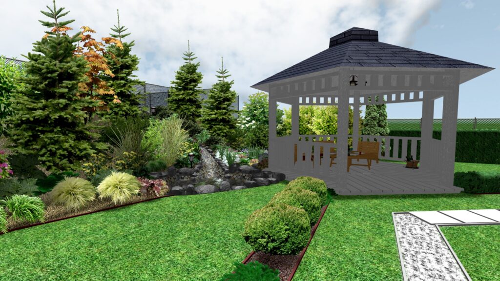 Majitelé při budování zahrady mají možnost vybrat si a nejprve vytvořit od altánu nahoru jednodušší cestu ze šlapáků a později vybudovat vodní prvek →