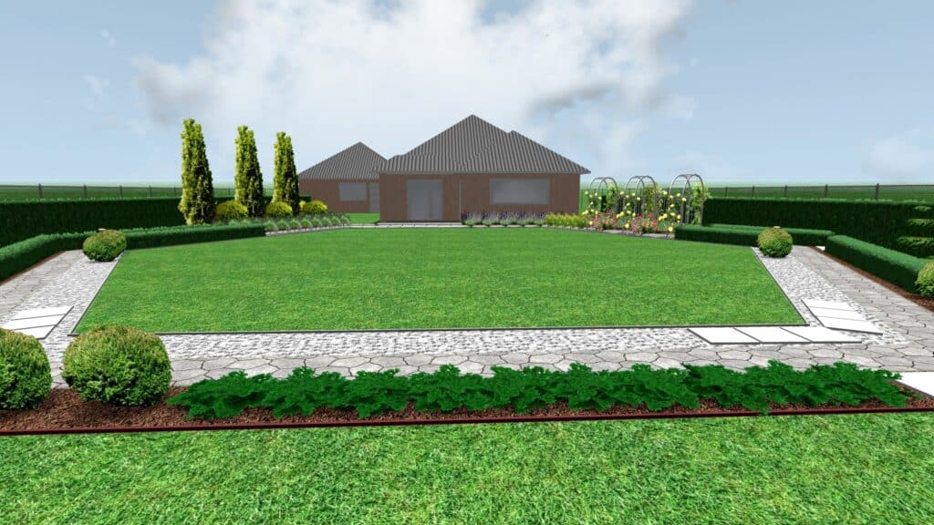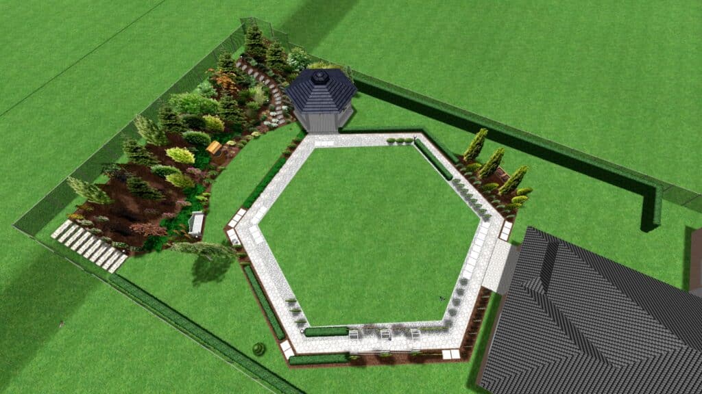 Za rodinným domem byla velká zatravněná rovina, která se zvedala do krátkého, ale poměrně prudkého svahu. Ten stále končí rovinkou s plotem. Nový návrh zachovává velkou část trávníku tak, aby komunikace zahradou a doprovodné prvky vedly po jeho šestibokém obvodu. Zvedající se svah v pozadí je využitý jako „malířské plátno“ →