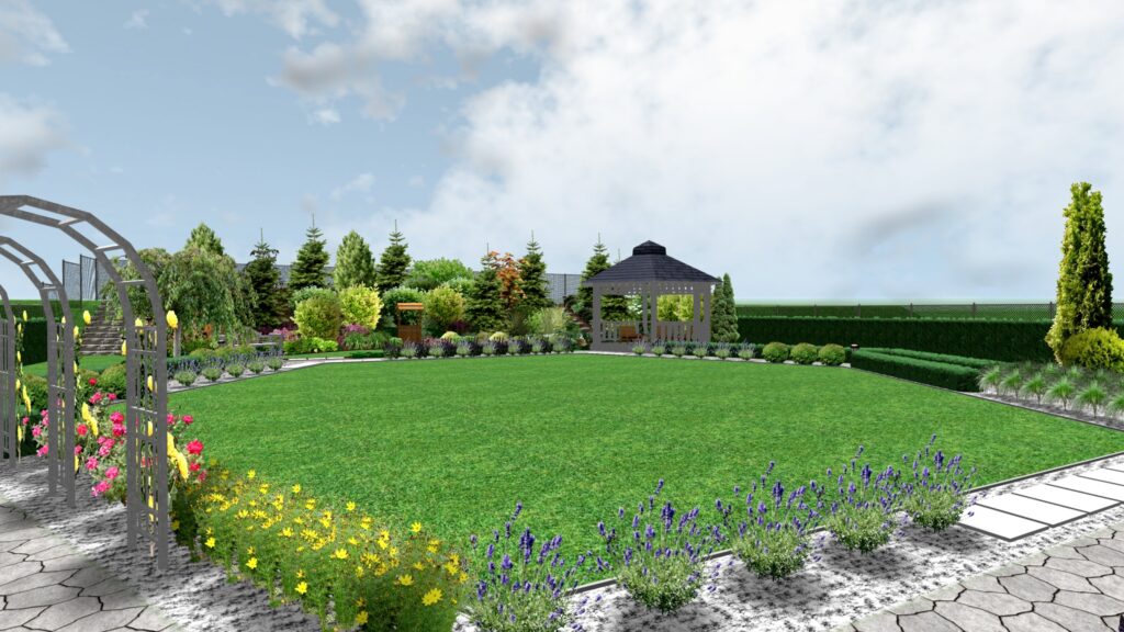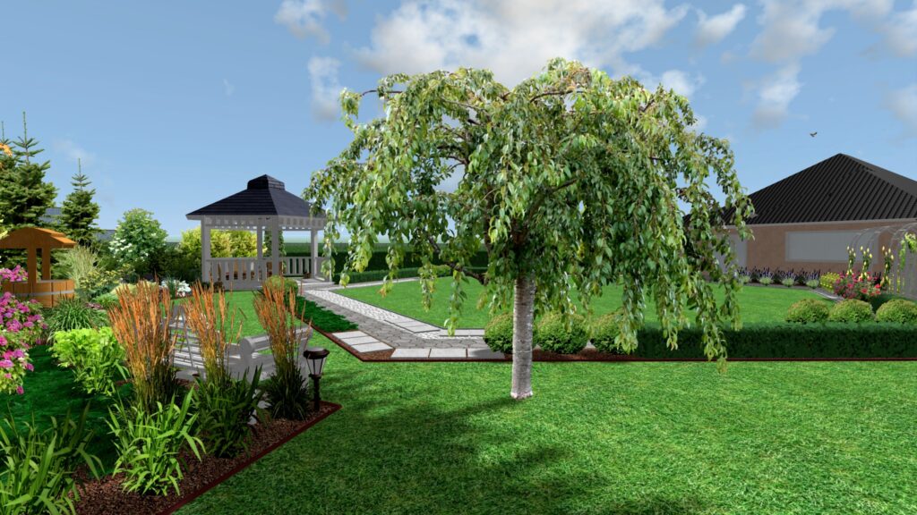 Základní tvar v zahradě dělá čest jménu obce. Středobodem návrhu zahrady je trávník ve tvaru plástve →