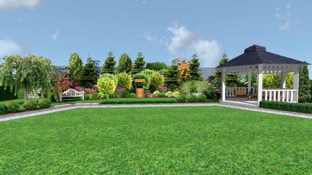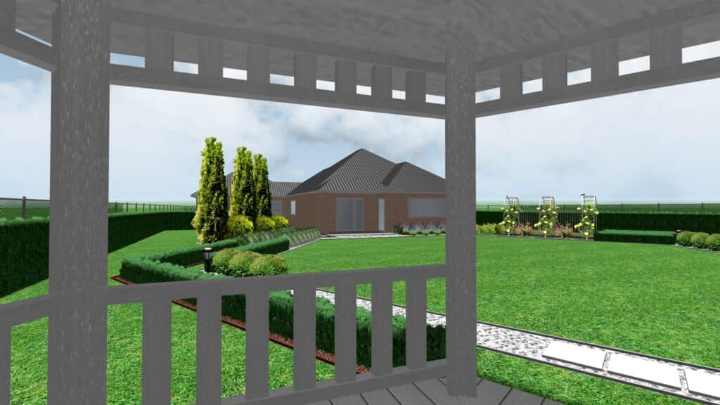 Altán je ze severu a zároveň od sousedních pozemků chráněný žlutolistými svídami Cornus alba ‚Aurea‘ nebo ‚Spaethii‘ a kultivarem zeravu Thuja occidentalis ‚Malonyana‘ →