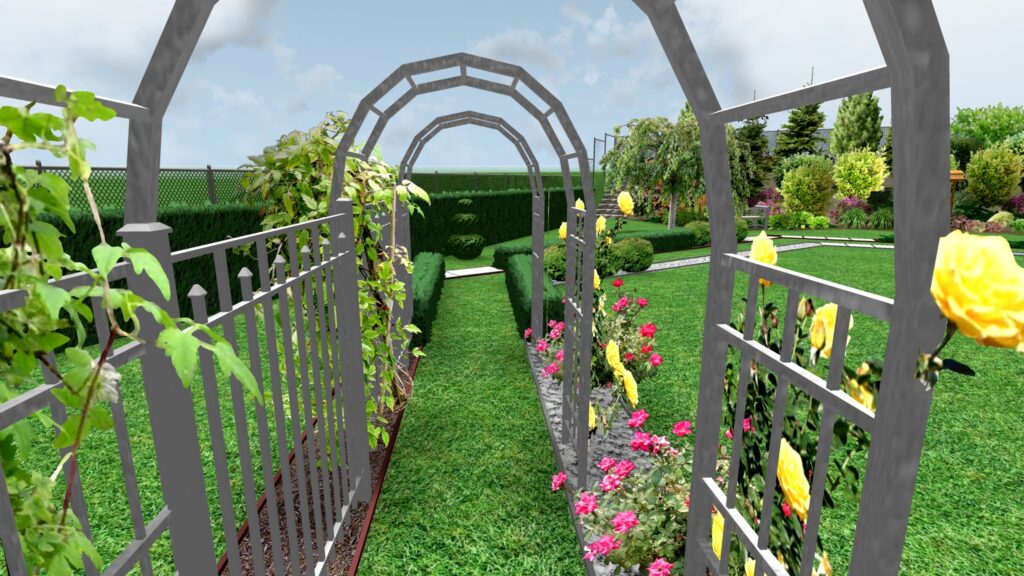 Mezi oblouky se žlutými růžemi jsou vysázené sytě růžové keřové růže svraskalé Rosa rugosa ‚Hansa‘ případně ‚Moje Hammarberg‘.