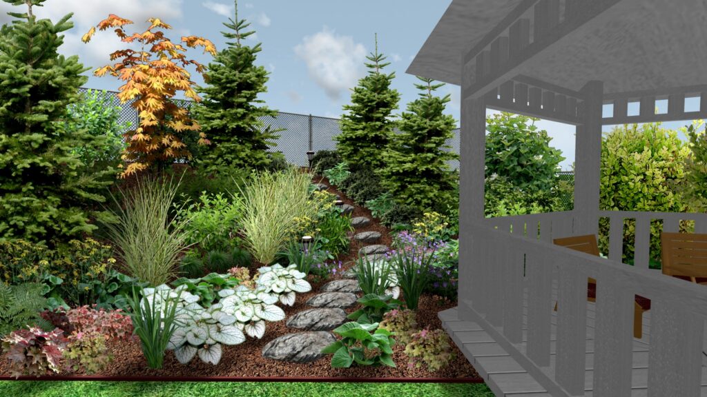 Ve stínu altánu a zároveň na vlhčím místě při patě svahu jsou vysázené trvalky milující stinné a vlhké stanoviště, jako jsou poměnkovce Brunnera macrophylla, Brunnera macrophylla ‚Jack Frost‘, kosatec sibiřský Iris sibirica, kakosty Geranium pratense ‚Johnsons Blue‘, Geranium psilostemon, dlužicha s oranžovým listem např. Heuchera ‚Marmalade‘ nebo ‚Peach Flambe‘, dlužicha s růžovým listem např. Heuchera ‚Berry Smoothie‘. Pod stromy je vysázená vyšší žlutě kvetoucí popelivka Ligularia dentata spolu s trsy žlutě panašované ozdobnice Miscanthus sibirucus ‚Strictus‘ →