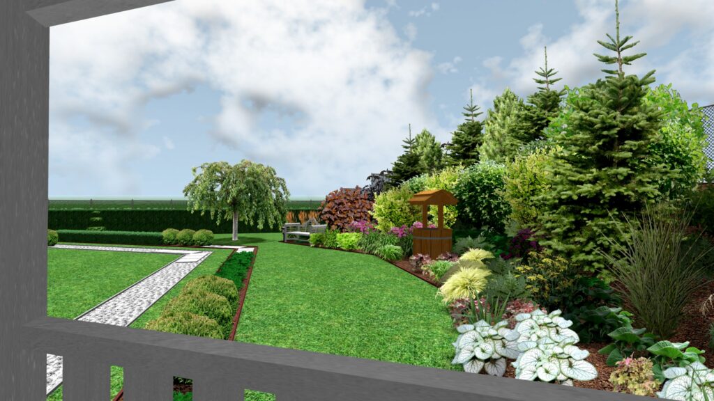 Chodník běží jako stuha uprostřed záhonů s blokovou výsadbou. Záhony jsou pokryté kůrovým nebo štěrkovým mulčem.