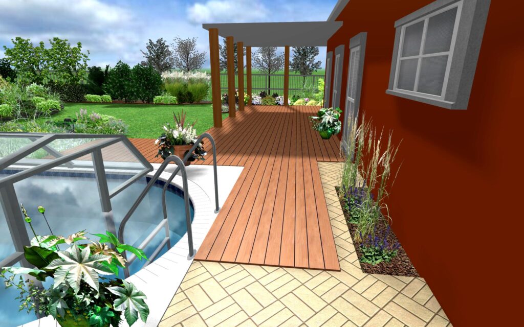 Na garáž a stání navazuje navržená dřevěná pergola ve tvaru L, která je protiváhou zastřešené terase stejného tvaru obklopující JZ roh domu. Pergola pomáhá odclonit parkování aut a zároveň napomáhá tomu, aby se zeleň organicky přehoupla ze středu přední zahrady k výsadbě podél jižního plotu. Pod pergolou začíná chodník vedoucí kolem bazénu ke vstupním dveřím do domu. Výhledy z chodníku obsáhnou bohatou zeleň přední zahrady.
