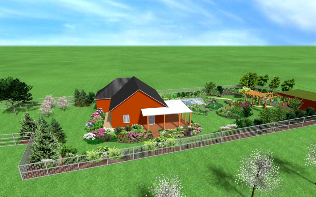 Přední nebo také jižní zahrada se nachází mezi zázemím pro auta a domem s bazénem a terasou. Zadní nebo také severní zahrada se nedaleko za domem zužuje a přechází v zamýšlený sad.