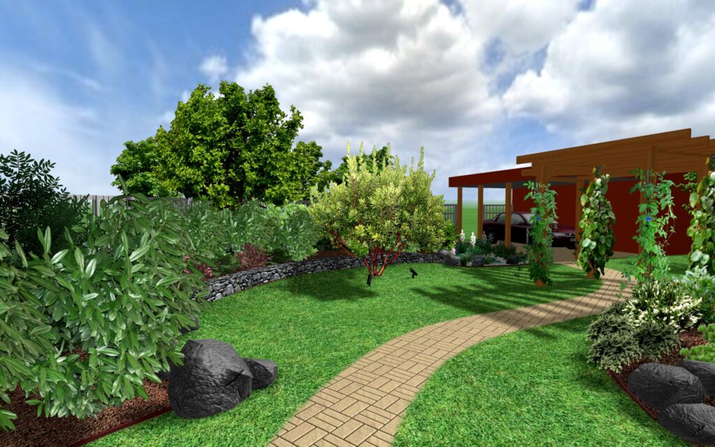 Návrh zahrady řeší jižní přední zahradu a zčásti také severní zadní zahradu: od oblastí přiléhajících k domu až po zúžení pozemku.