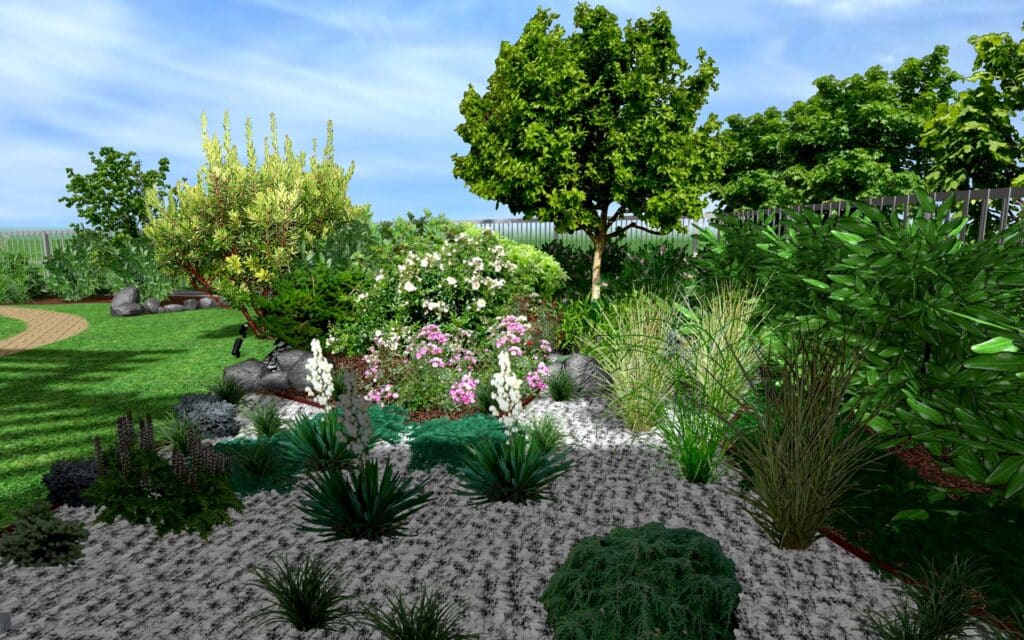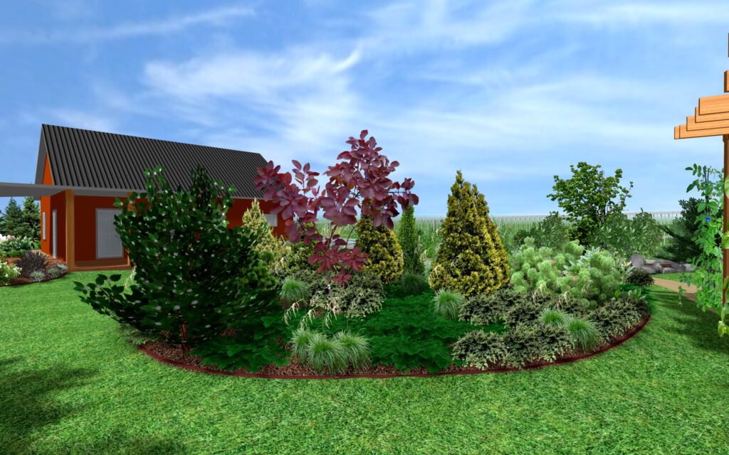 Návrh vznikl v úzké spolupráci s majitelem podle jeho představ o budoucí zahradě. Jako milovník zeleně si přál bohatou výsadbu a výsledek je ten, že je zahrada jednak osázena mnoha různými druhy a kultivary a jednak je celkově plocha záhonů nadstandardní vzhledem k ploše trávníku (jsou prakticky půl na půl: 401 m2 záhonů a 410 m2 zatravněné plochy).